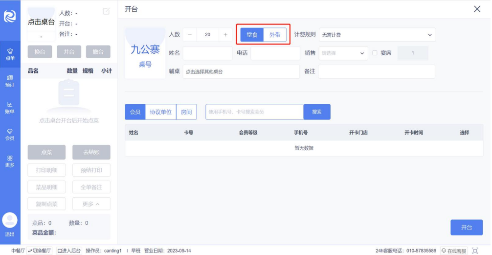 外带开台:外卖客人可选择使用外带点餐(散客、会员、房间、协议单位),开的是虚台,不占桌台