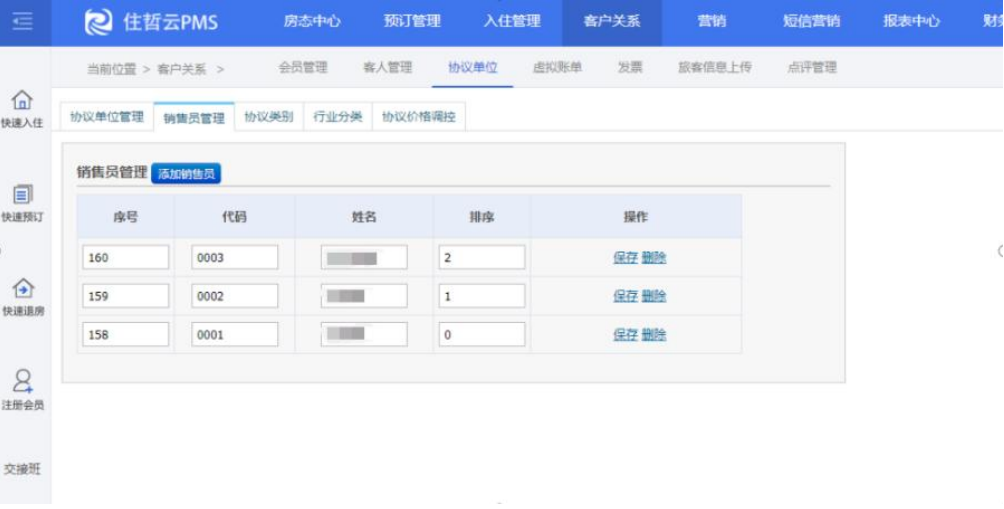 销售:非必选,显示住哲 PMS 中的销售员(销售员设置路径:住哲PMS--客户关系--协议单位–销售员管理),用于销售员业绩报表数据统计