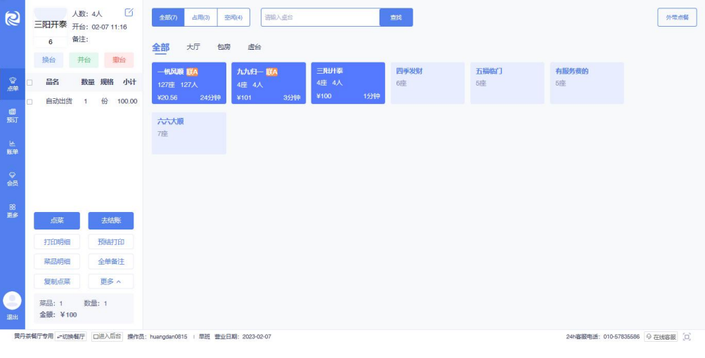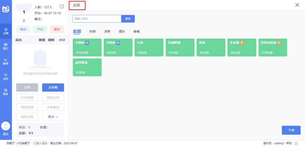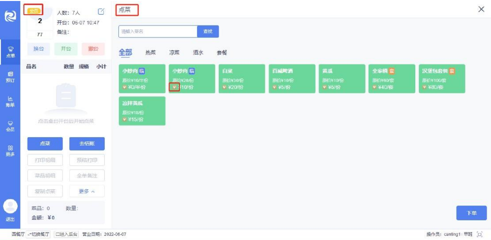 ③ 点击右下角开台即开台成功,自动进入当前桌台的点菜页面,菜品价格显示为会员价;桌台列表显示桌台名称、桌台座位数、桌台人数、会员标签、消费金额、开台时长。