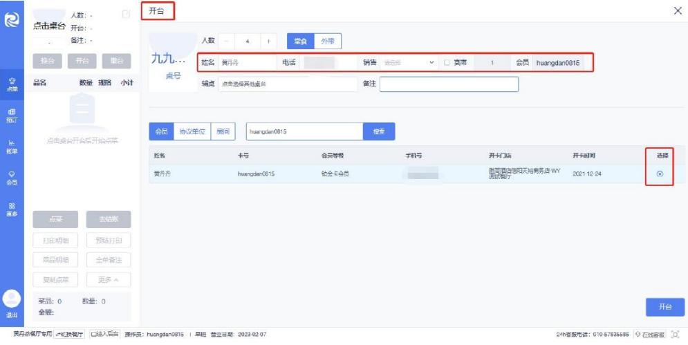 ② 输入会员卡号或手机号进行搜索,选中会员后,自动填充会员姓名、电话、会员卡号(注:会员为单选,选中后再选择其他会员、协议单位、房间客人,桌台信息会被替换,以最终选择为准)