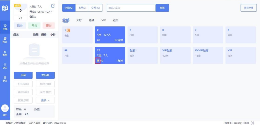 低消提示:当该桌台设置最低消费,并设置“开台时提醒”时,将展示最低消费提醒