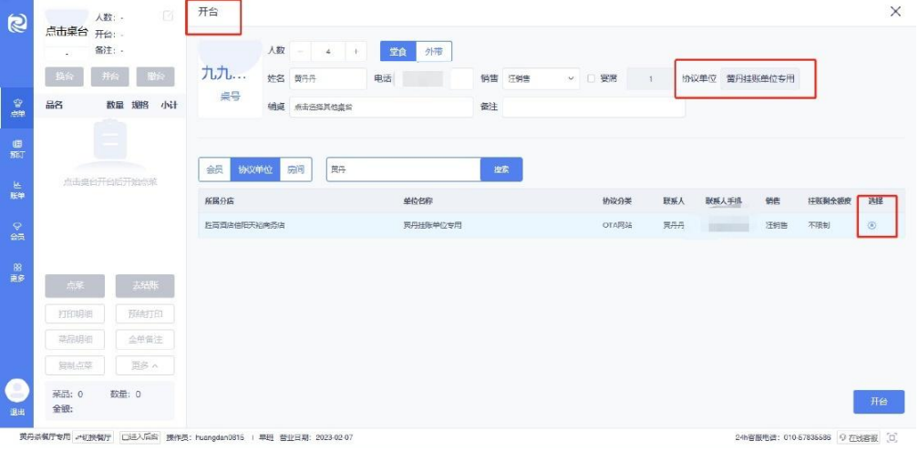 ② 输入协议单位名称进行模糊搜索,选中单位后,自动填充姓名、电话、销售、协议单位名称(注:协议单位为单选,选中后再选择其他会员、协议单位、房间客人,桌台信息会被替换,以最终选择为准)协议单位信息设置路径:住哲 PMS--客户关系--协议单位--协议单位管理