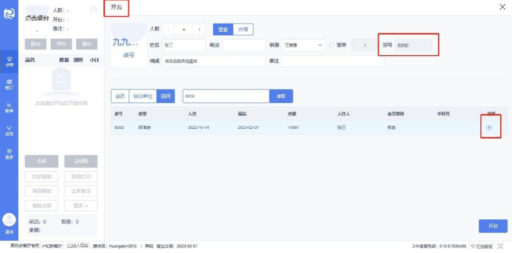 ② 输入房间号进行搜索,选中房间后,自动填充会员姓名、电话、房号、会员卡号