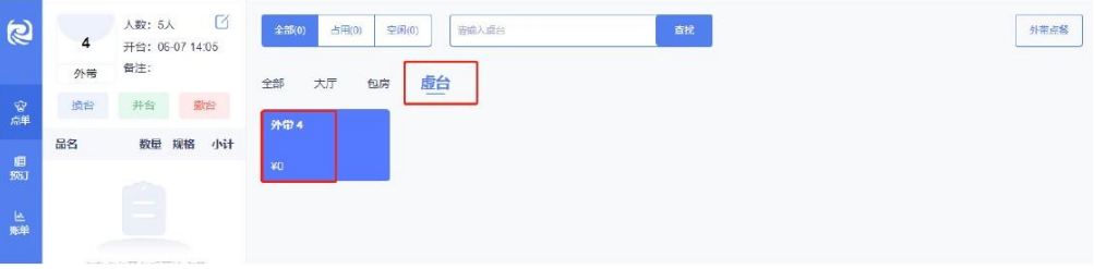 ③ 外带开台后生成一个虚台,不论是散客、会员、协议单位、房间开台,列表只显示外带号与消费金额