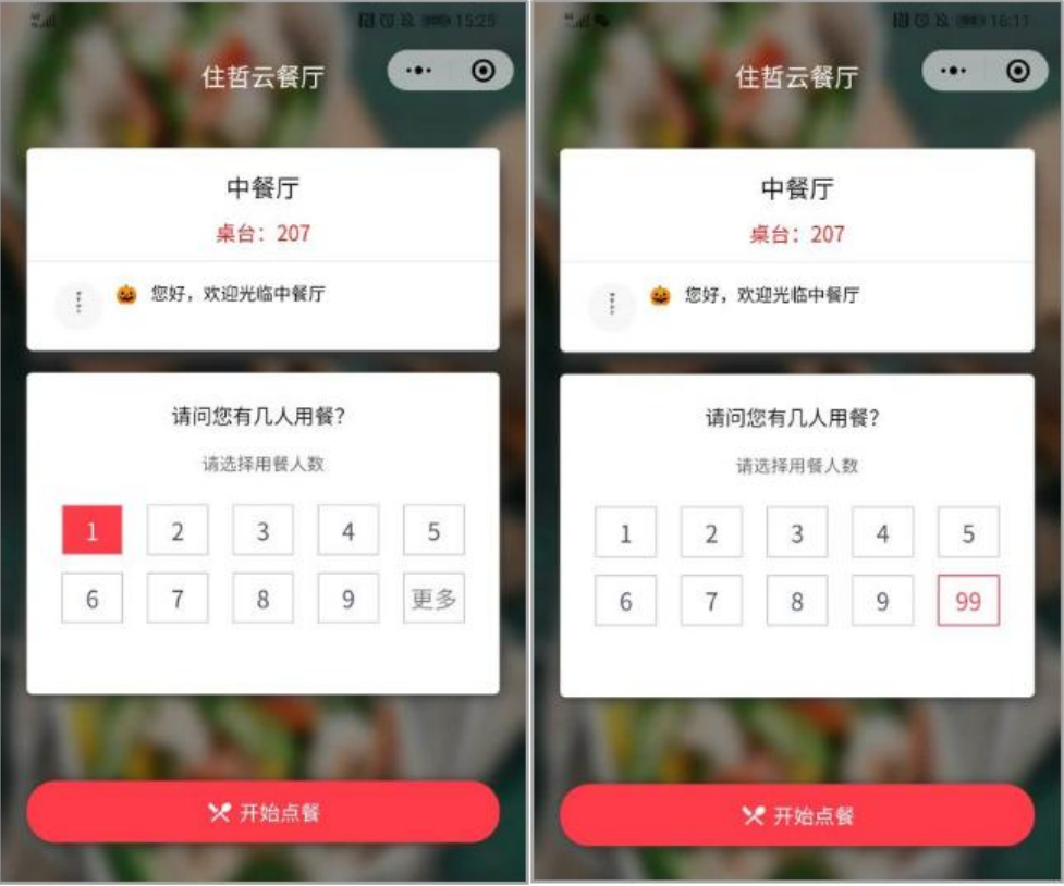 用餐人数:用餐人数必选,默认选中 1,点击更多,可在输入框里输入用餐人数,最多只能输入2位数