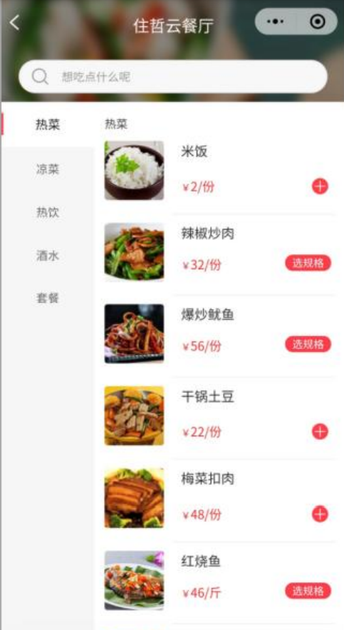②选择完用餐人数后点击开始点餐则开台成功,页面进入小程序点菜列表页面