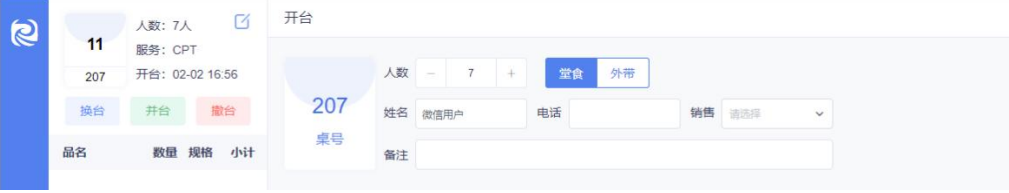 ③ 收银台同步开台信息,服务员为 CPT、人数为小程序开台选择的人数、姓名为微信用户