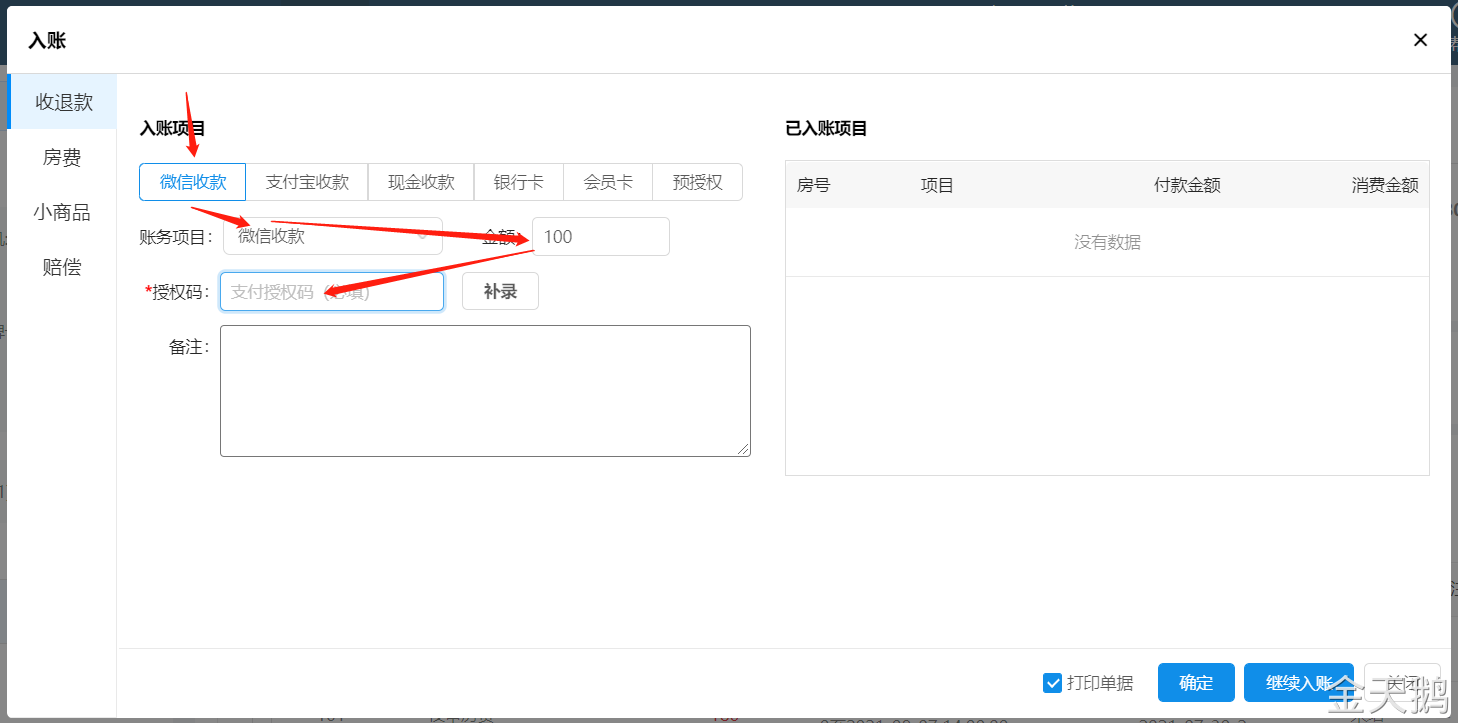 在住收款:打开房间账务,选择【入账】--【收退款】--【微信收款】--【收款金额】--鼠标放在【授权码】一栏,通过扫码设备扫描客户付款码完成收款。