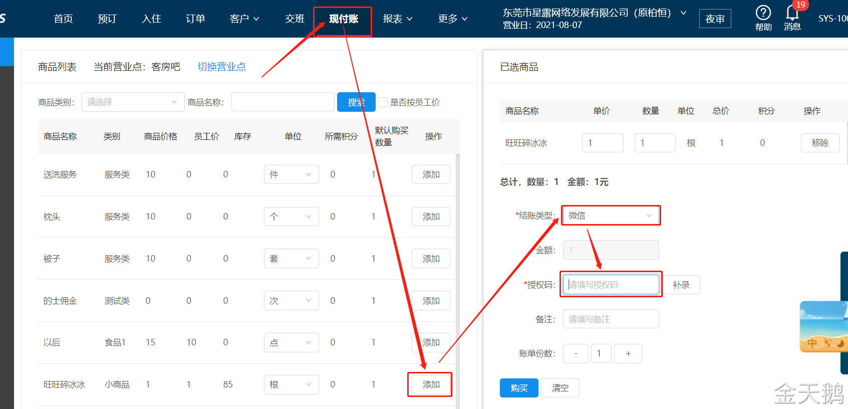 现付账收款: 点击【现付账】--【添加商品】--【结账类型】,选择微信--鼠标放在【授权码】一栏,通过扫码设备扫描客户付款码,完成收款。
