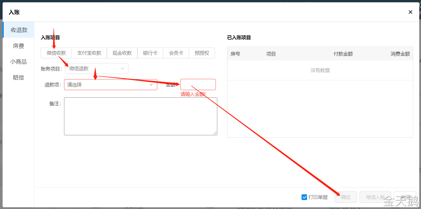 在住退款:选择 【入账】--【收退款】--【微信收款】--【微信退款】--【退款项】,选中需退款项--【金额】,确认退款后,操作确定即可。