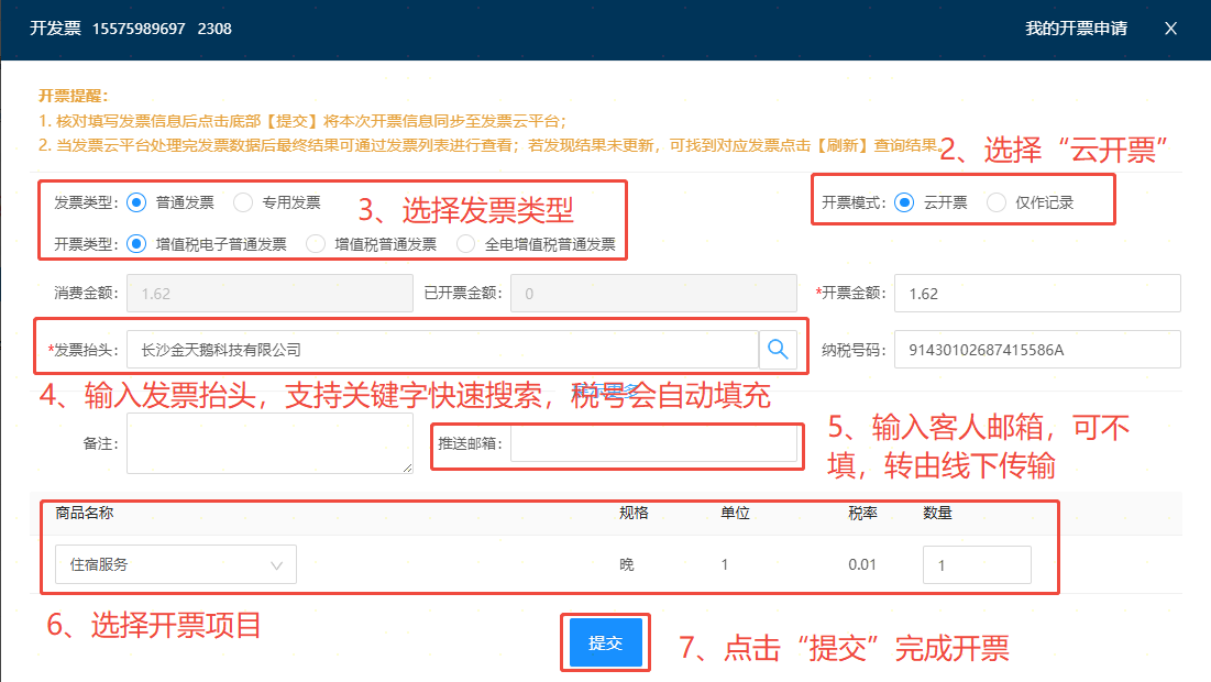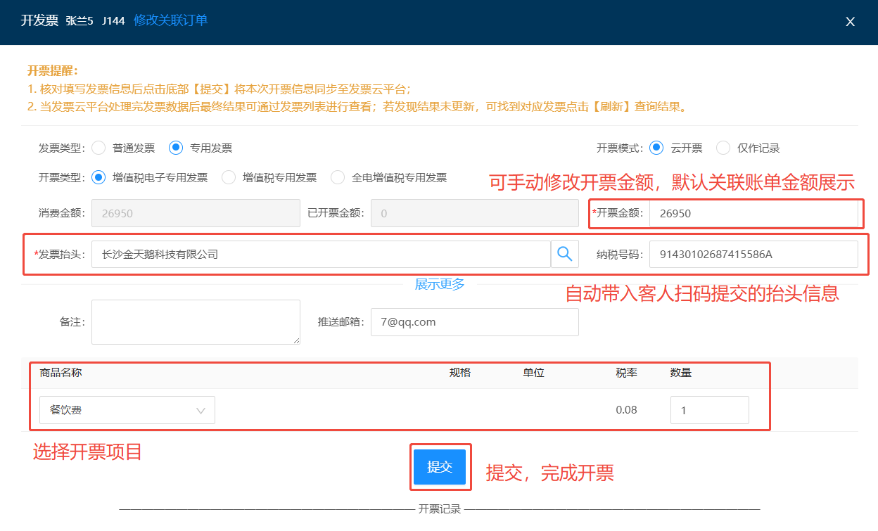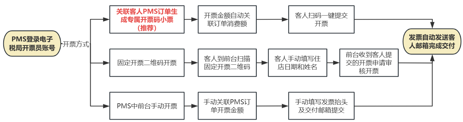 客人拿到专属开票码--扫码--填写发票抬头--选择地址、银行信息是否展示票面--填写收票邮箱--提交