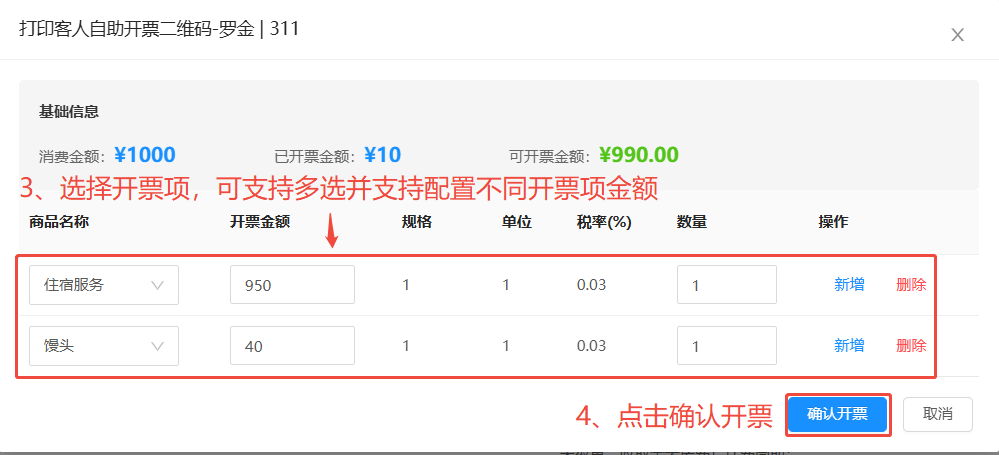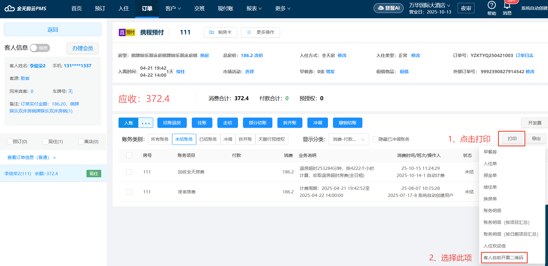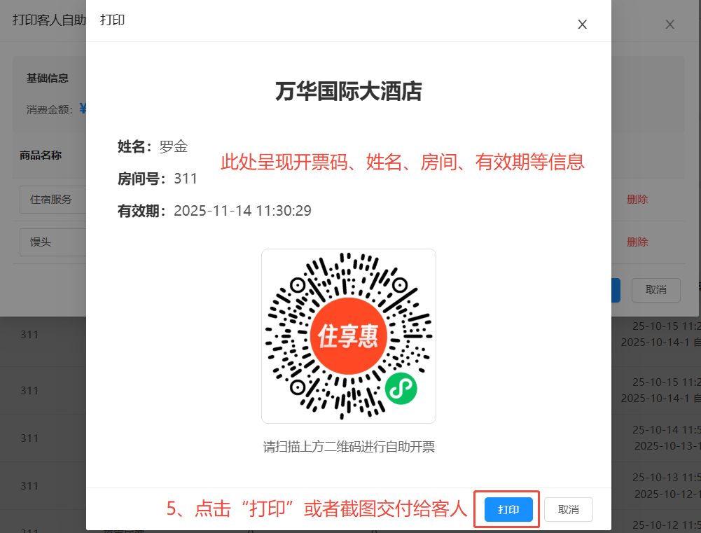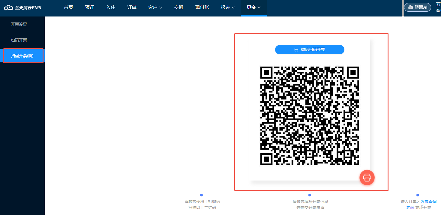 打开PMS需要开票的客人订单--点击“打印”--选择“客人自助开票二维码”--选择开票项目及对应开票金额--确认开票--交给客人--结束