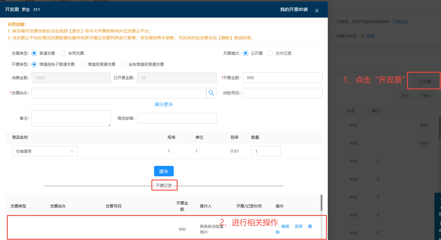 客人提交成功后,在开票申请-待开票(新)申请列表中可看到客户提交的记录,点击“开开票”按钮,可针对客人提交的开票申请进行手动开票