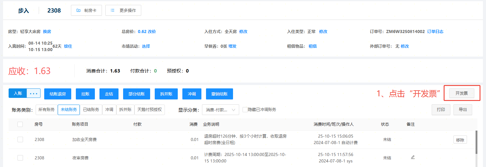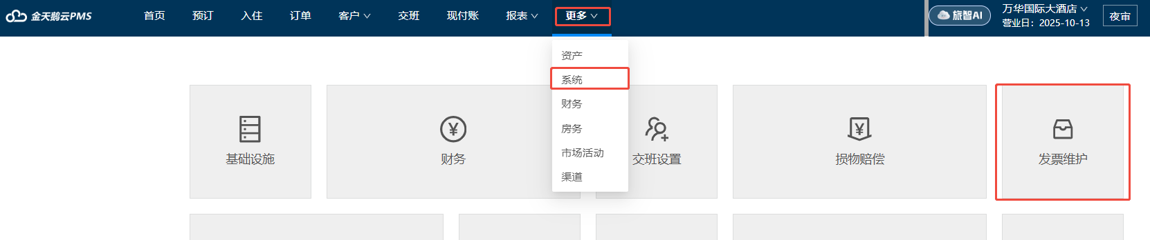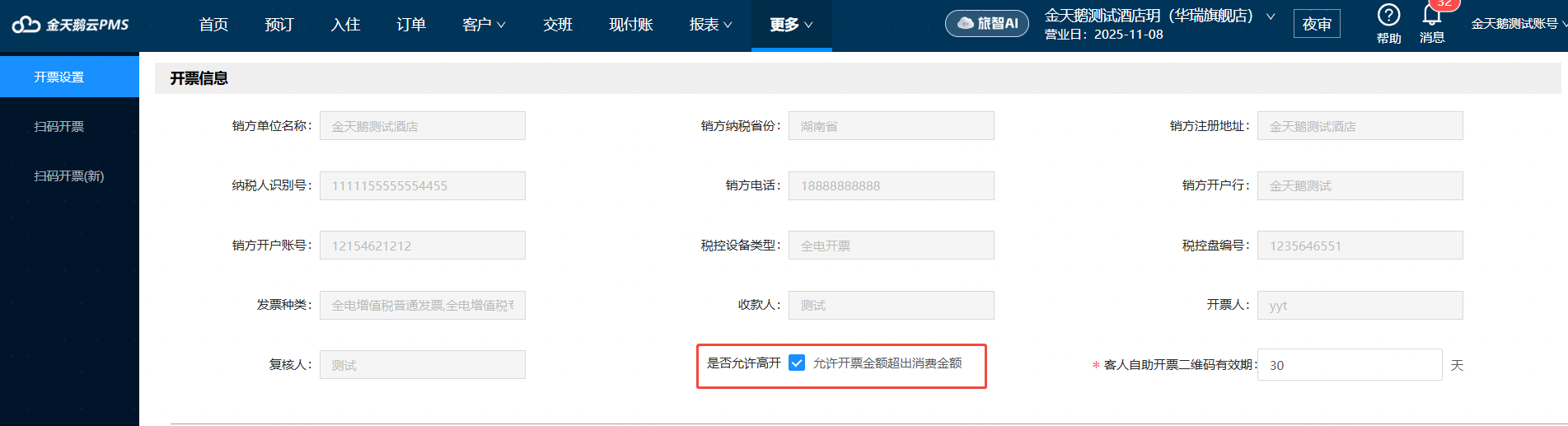 对订单进行发票开具,在开票界面会显示消费金额和已开票金额,PMS支持允许开票金额超出消费金额,可前往 更多-系统-发票维护-是否允许高开