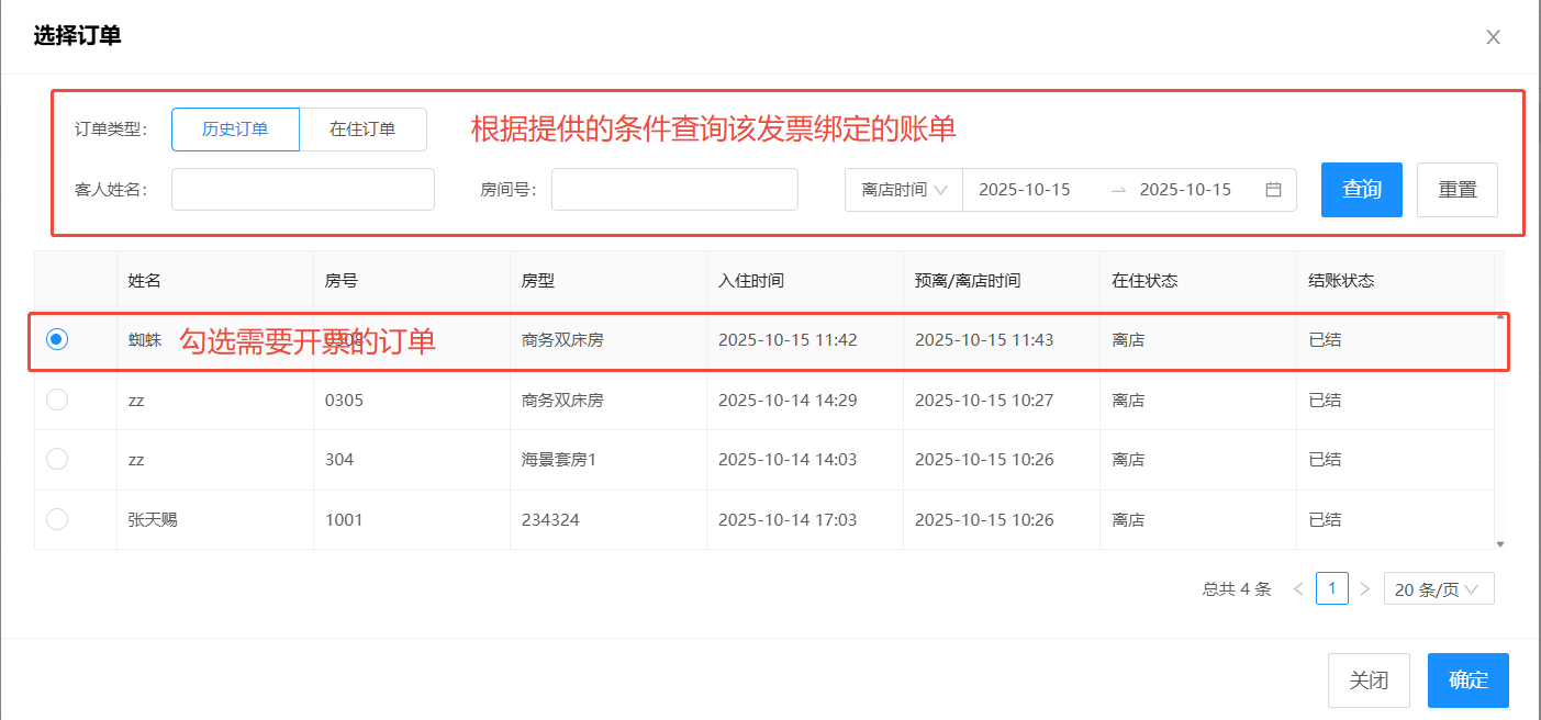 点击进入开发票之后,需要选择关联的PMS订单,可根据客人姓名、房间号、离店时间等条件组合查询,找到订单后点击勾选后,再点击“确定”按钮进入开发票详情页