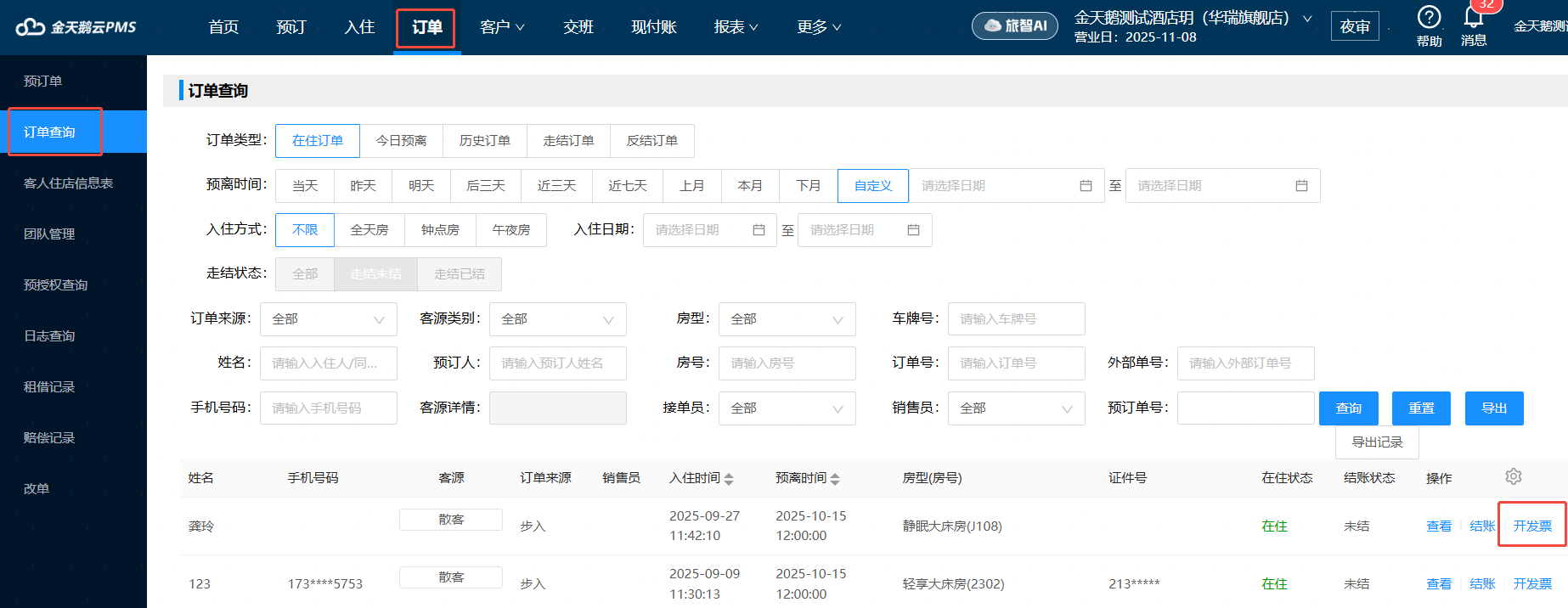 在报表中心-已开发票报表,可按时间筛选已开发票报表,并支持发票状态,组单号,房间号进行查询与导出,前台可导出,直接发送财务即可。(强烈建议酒店前台发票开具全部通过PMS系统操作,无需再通过表格进行手工登记开票信息)