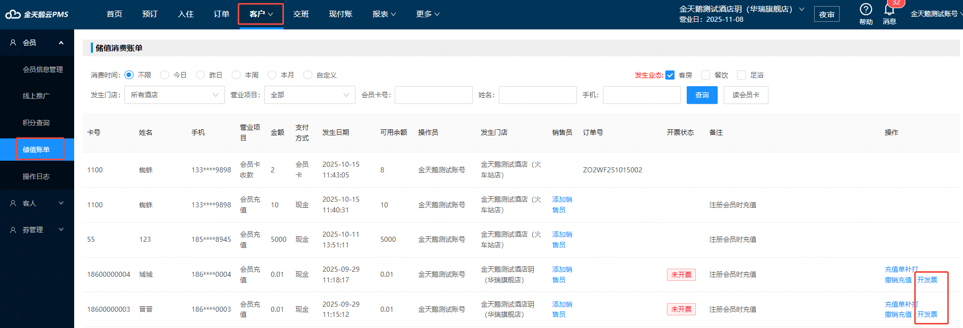 会员储值发票不关联账单,需要在客户--会员--储值账单中找到充值记录,点击后方“开发票”按钮进行开票,操作方式同手动开票流程