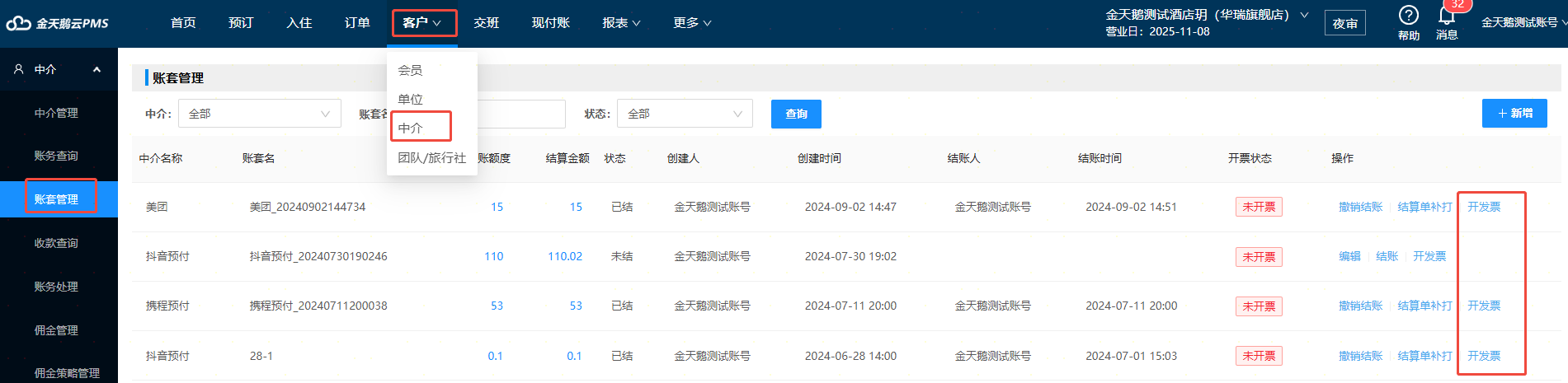 中介账务及协议单位账务也可以在PMS中开具发票,以中介举例,操作路径为:客户--中介--账套管理--找到对应账套后点击后方“开发票”按钮进行开票,操作方式同手动开票流程