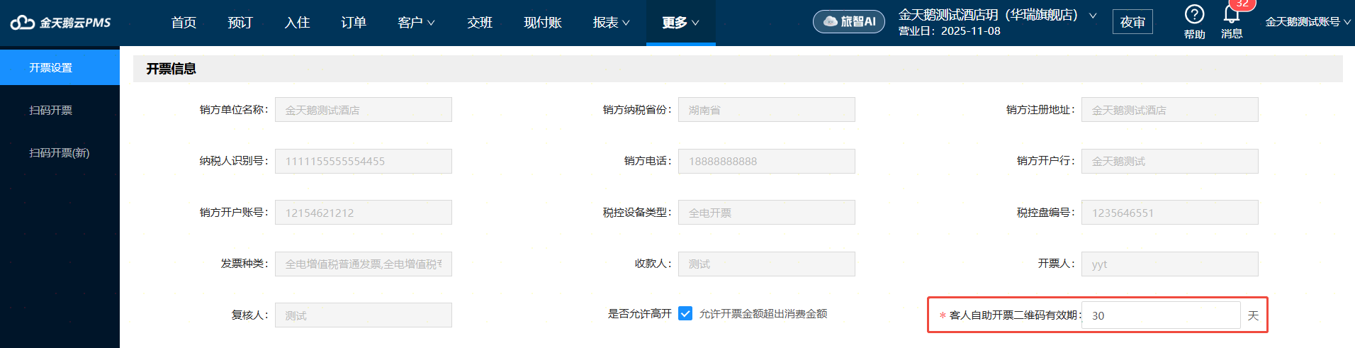 设置路径:更多-系统-发票维护-客人自助开票二维码有效期
