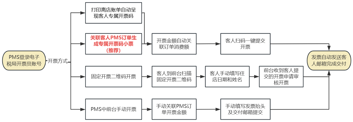 此模式适用于不会操作手机扫码开票的客人,如年长的客人等,该方式作为补充开票手段,完全由酒店工作人员在PMS中直接开票