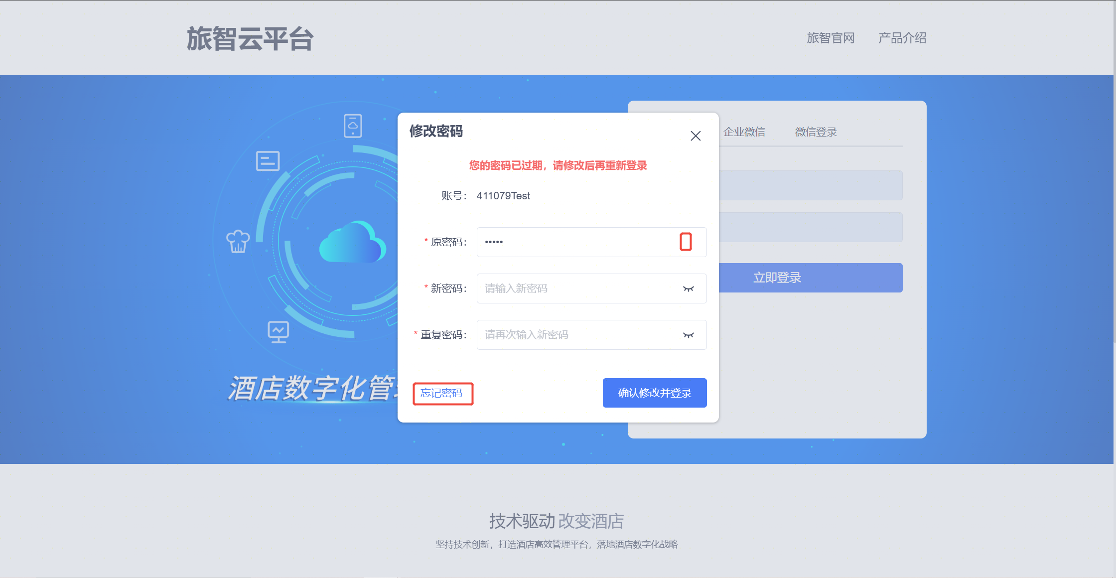 1.在旅智云平台登录页,点击忘记密码,可以弹出密码重置窗口
