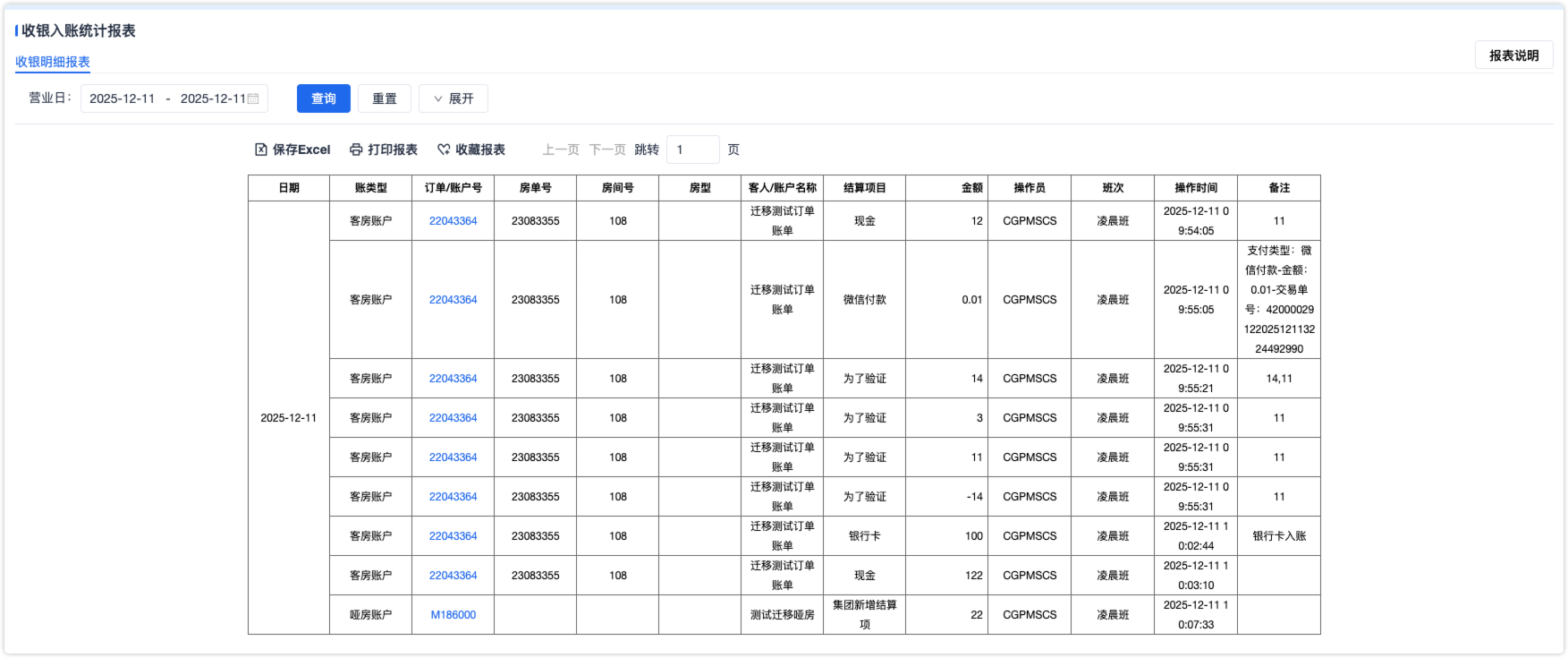 查看最细的收款明细列表,用于整理和定位到最终客人、房间、账户、结算项。