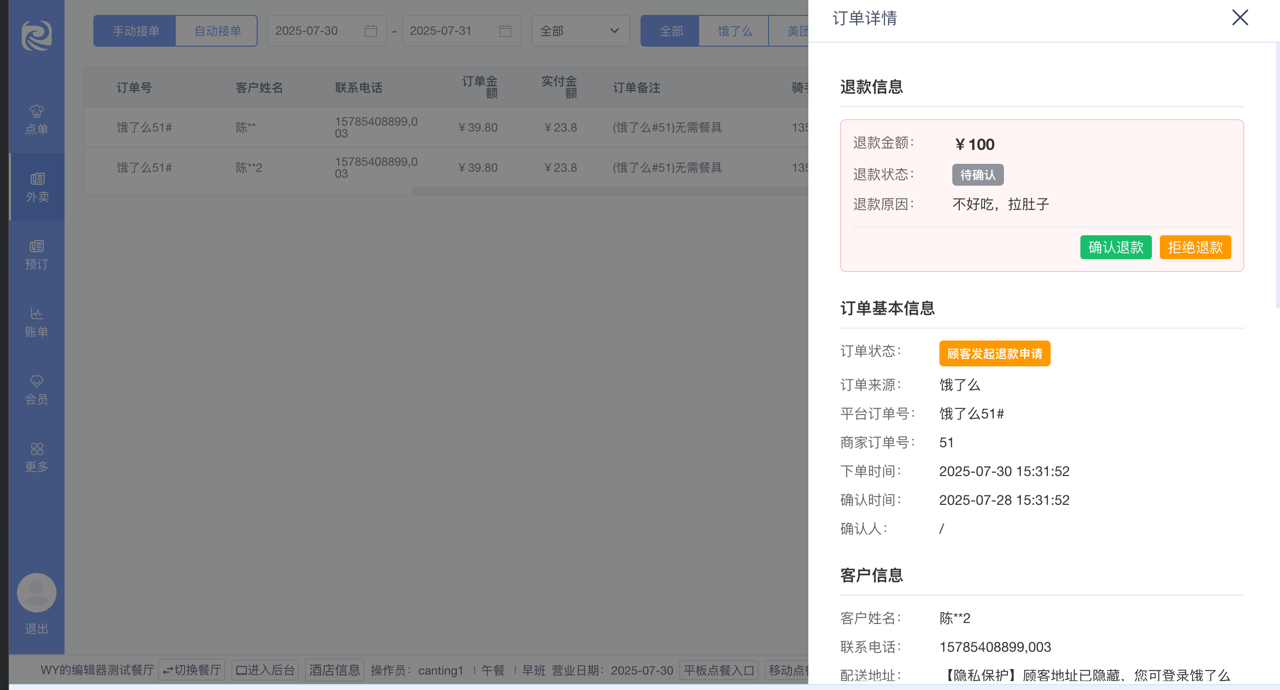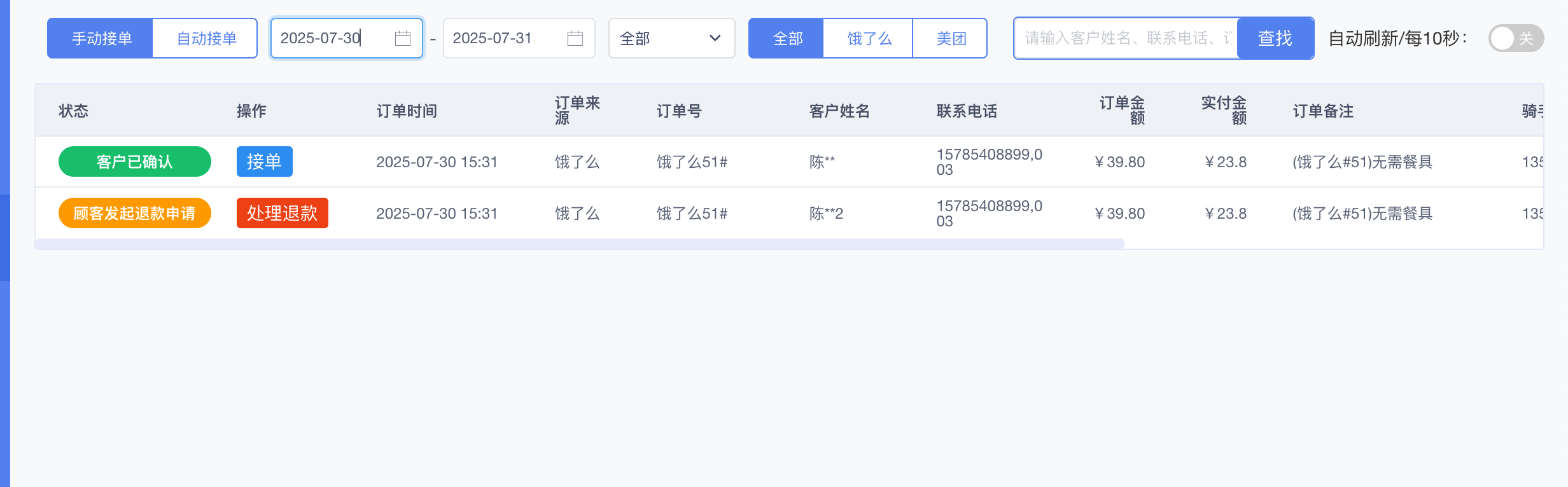 客户在云餐饮平台则会显示外卖的功能,用于接受和处理订单,默认自动接单,开启自动刷新