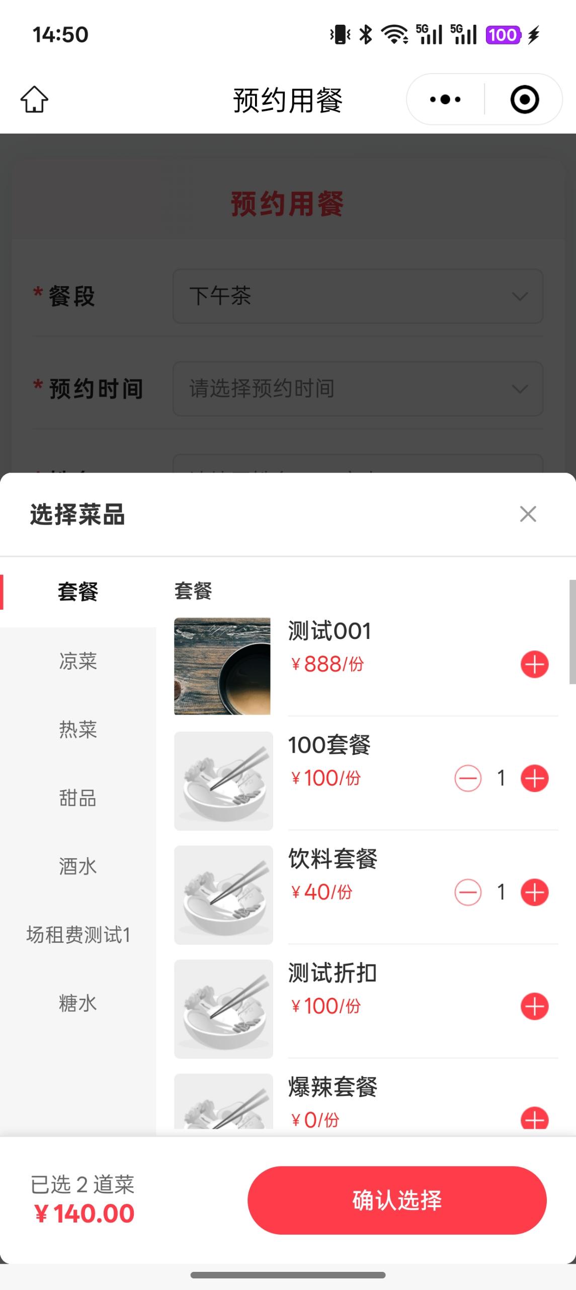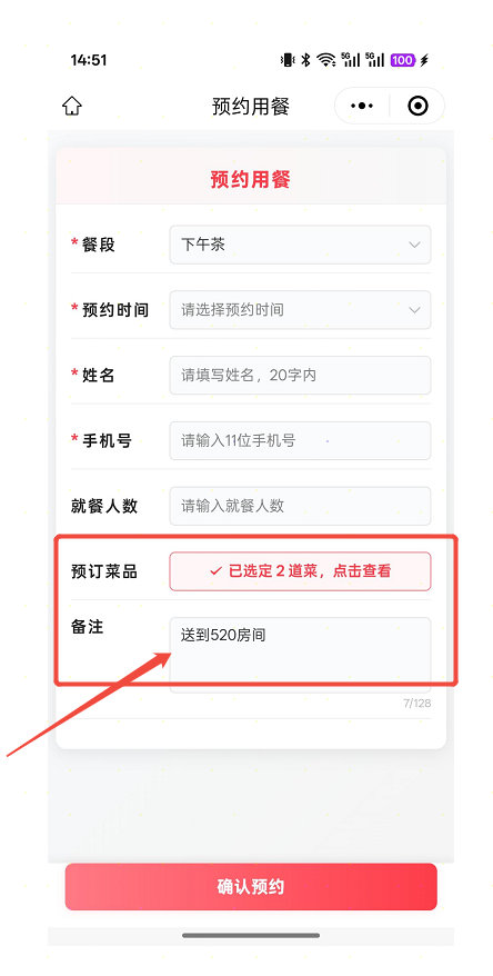 ● 填写必填项,备注需要给到酒店前台的信息,预定点菜,选择菜品