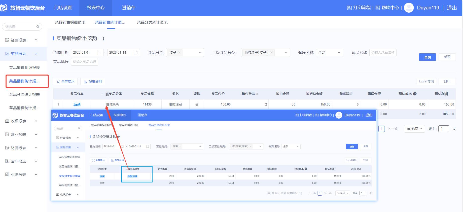 1、 菜品分类统计表 穿透到 菜品销售统计表(一)优化