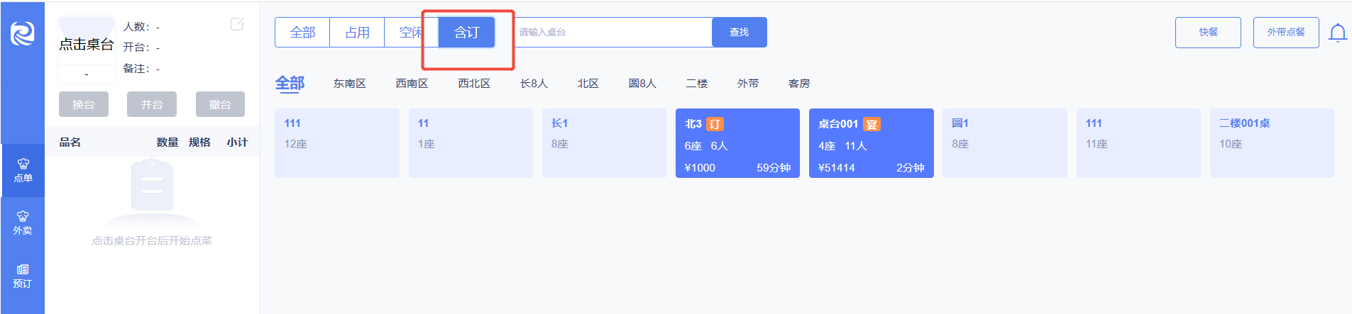 1. 前台桌台状态栏新增“含订”标识,可快速查看所有未到未开台、已开台未结账的预定相关桌台。