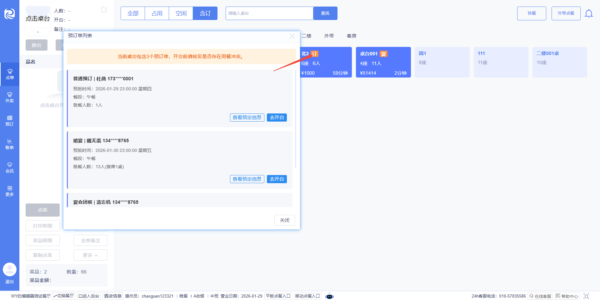 2. 点击桌台“订”字标识,可查看该桌有效预订单(支持普通预订、宴会团餐、宴会宴请),可查看订单详情、直接开台(宴会宴请将关联开台所有相关桌台)。