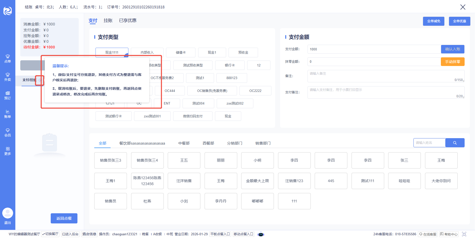 2. 结账页面新增温馨提示,明确退款规则及取消结账后退菜、修改流程,避免操作失误。