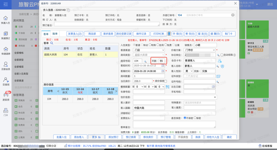 组单页面中入住天数可支持输入三位数,入住的时输入天数自动更新离店日期,在住时输入天数进行续住时弹出二次确认弹窗
