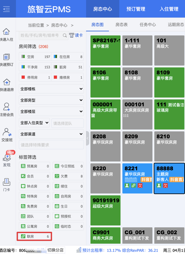 3. 房态图中的筛选条件增加联房的筛选,但点击联房筛选出来的房间不包含团队