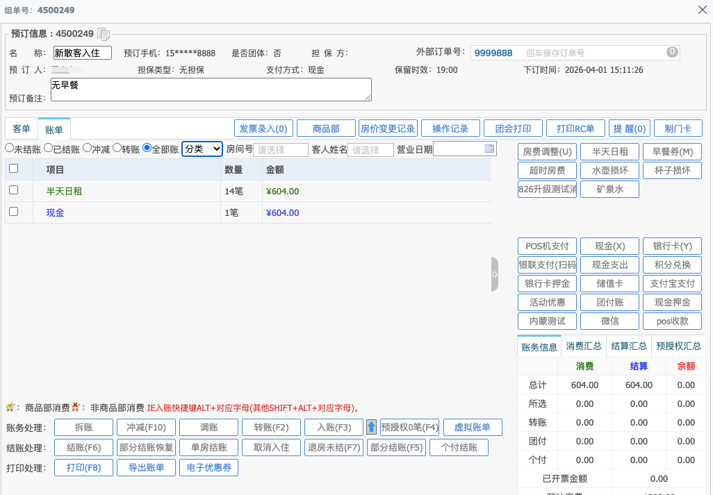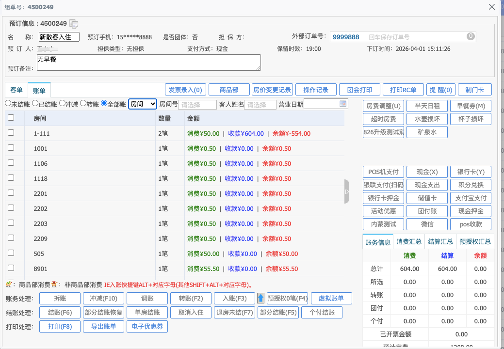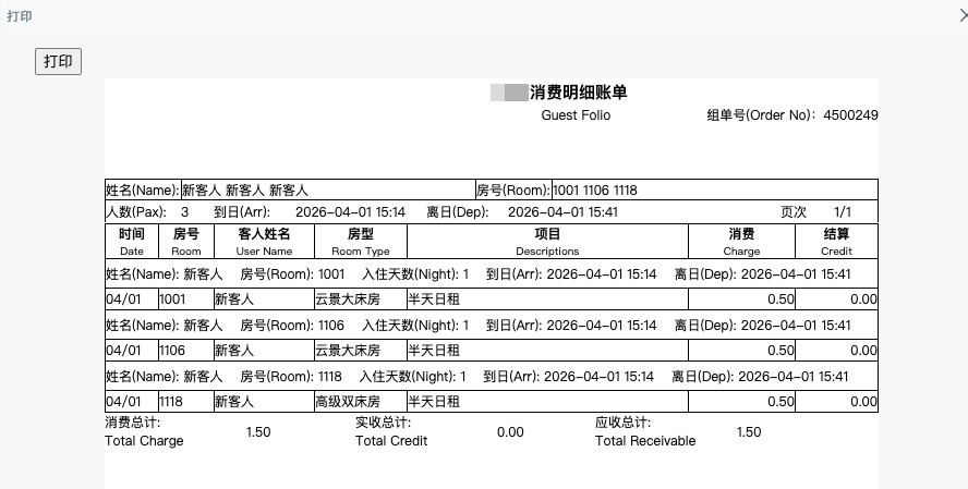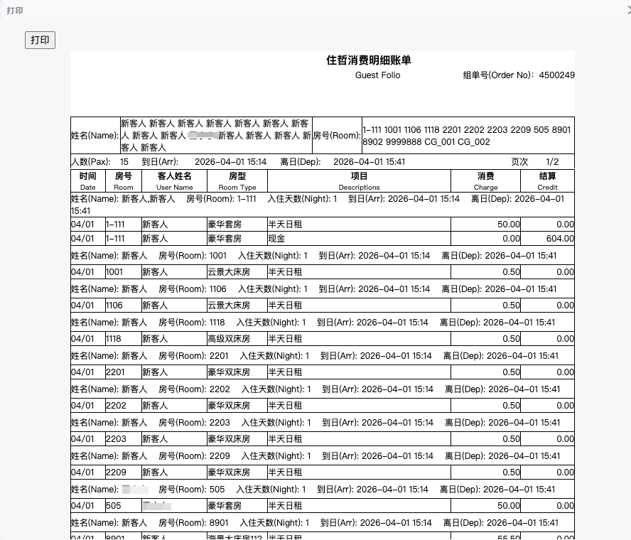 选择全部账,可按分类和房间号打印和导出账单,可以根据勾选进行打印,但导出时是全部记录