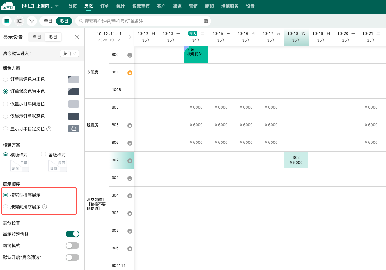 房态设置:支持设置默认展示单日房态/多日房态