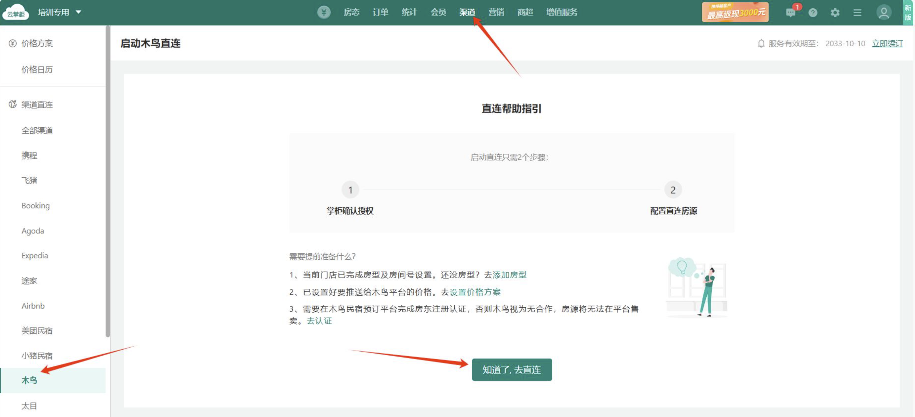 第一步、左侧导航栏点击「木鸟」渠道,查看帮助指引后,点击「知道了,去直连」按钮, 如下: