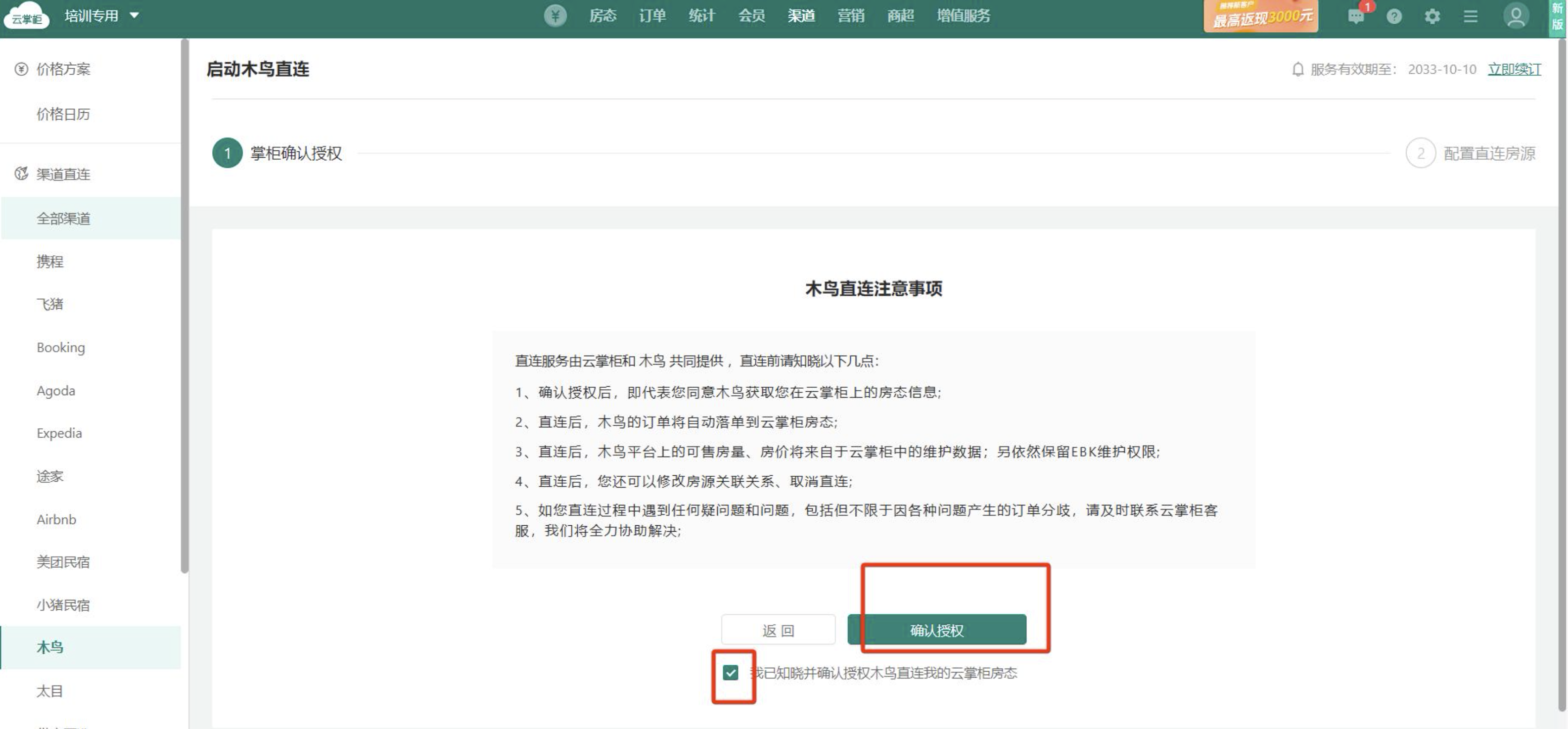 5、在云掌柜后台申请木鸟直连后,还需要登录您的木鸟后台关联云掌柜房间,直连才完成!!