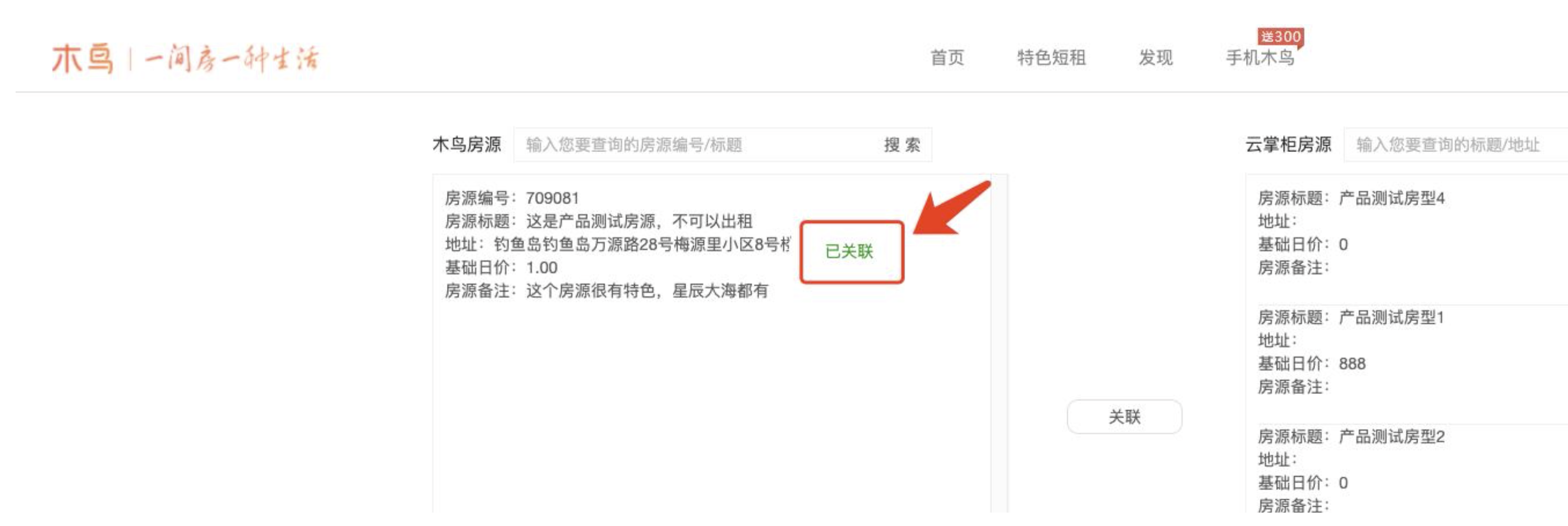 勾选木鸟房源-勾选要关联的云掌柜房型,点击【关联】按钮