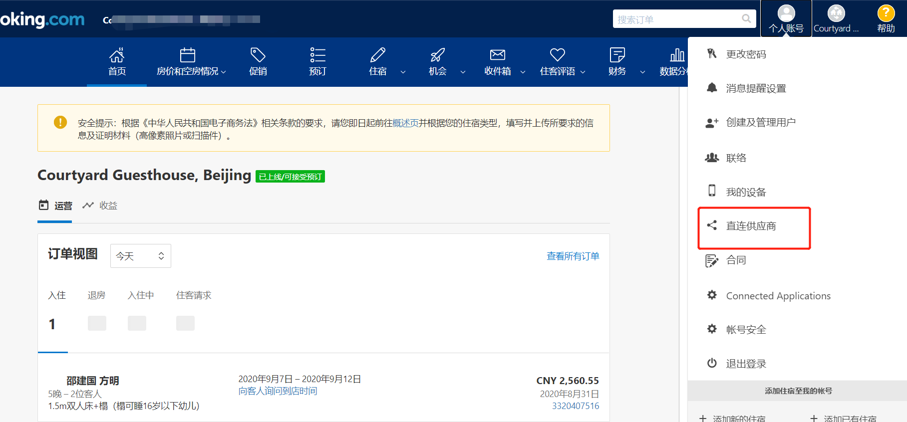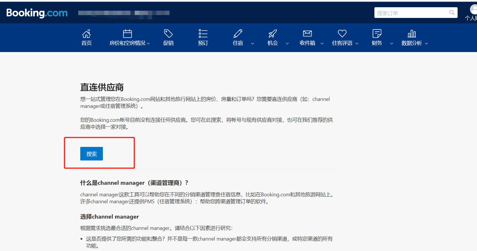 2. booking后台右上角,点击 个人账号-直连供应商(Channel Manager)。如果登陆booking后台实在找不到Channel Manager,通常是因为你的booking没有直连的权限,需要联系你的booking业务经理告知对方你需要开通booking的直连功能,等开通以后再接着操作以下步骤。