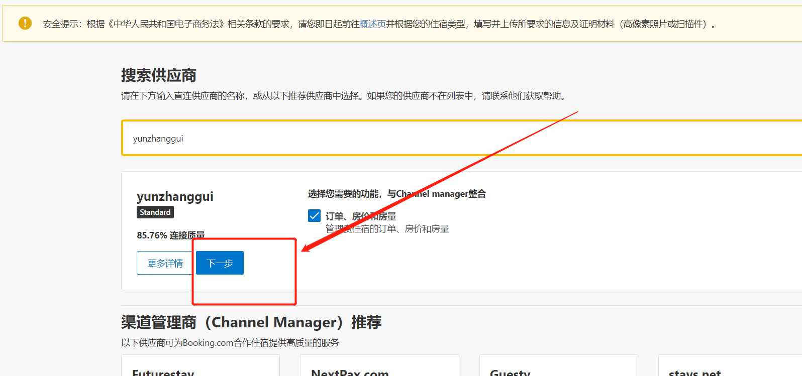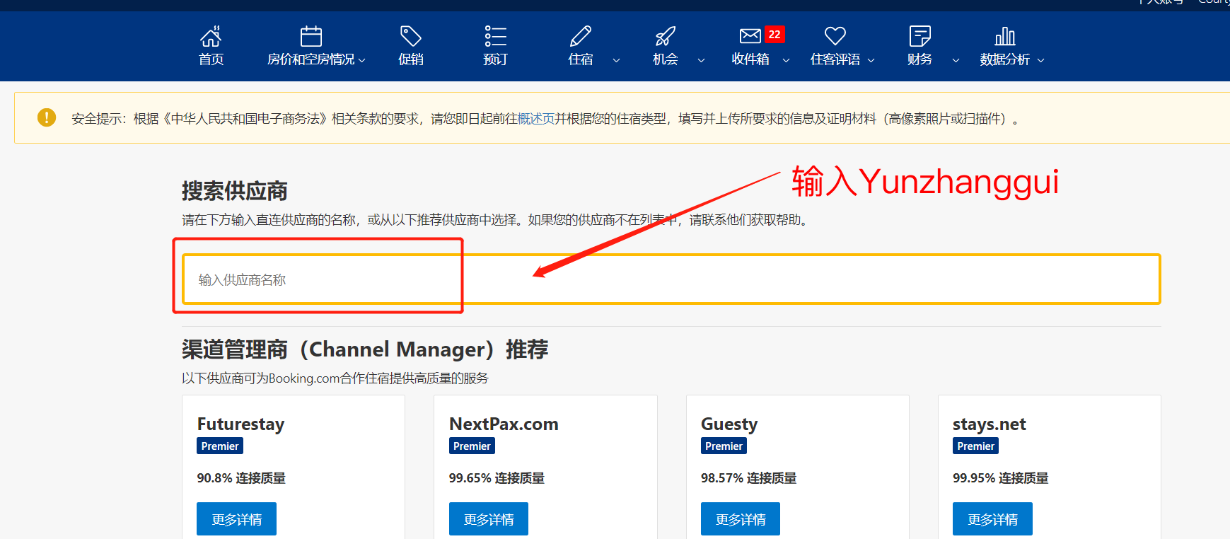 1、关联前,请先到Booking后台 Channel Manager 页面选择Yunzhanggui(ID 506)作为直连供应商