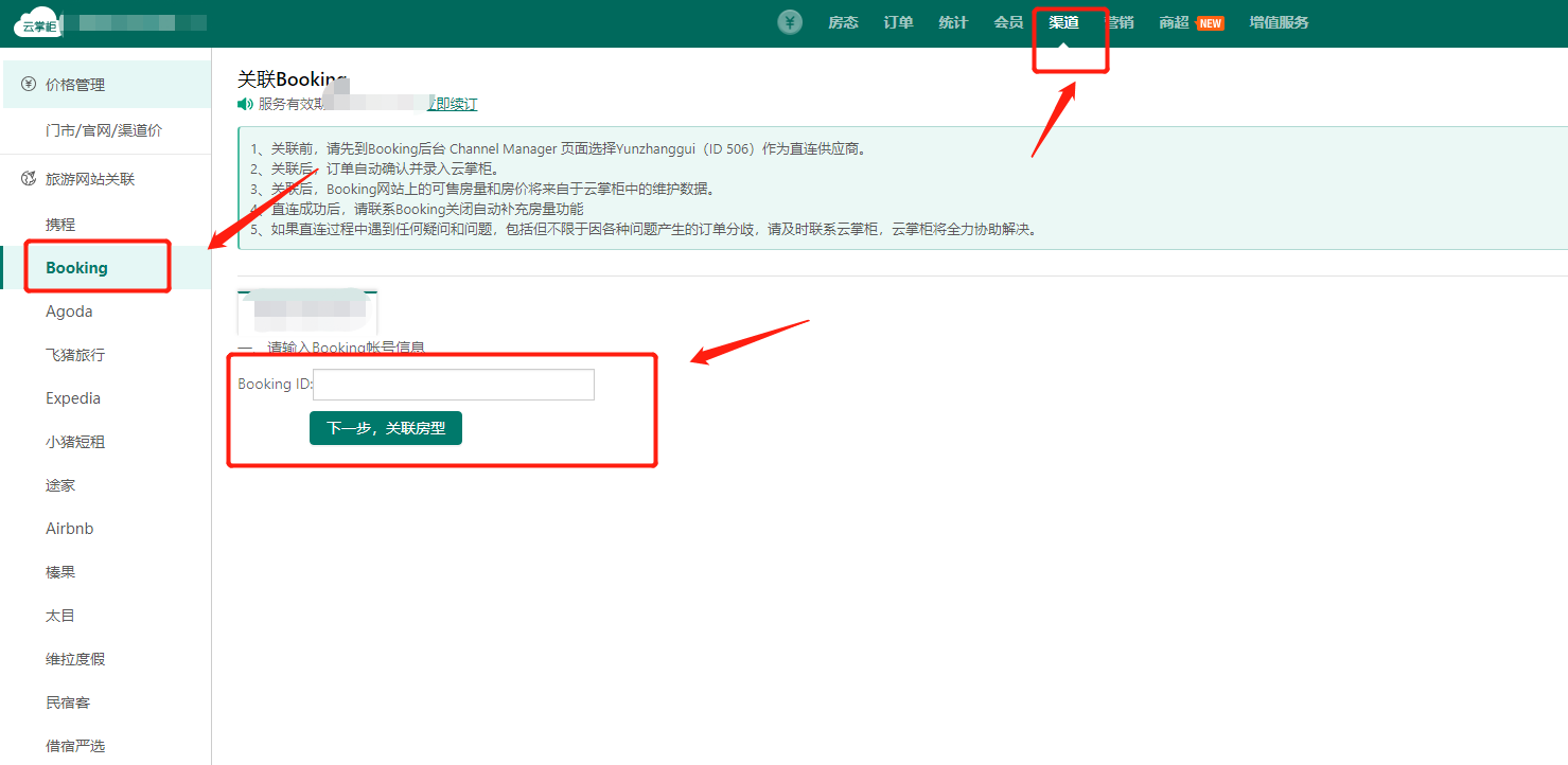6. 进入云掌柜 渠道直连,Booking直连的页面,点击开通Booking关联。输入Booking登陆账号(即酒店ID)