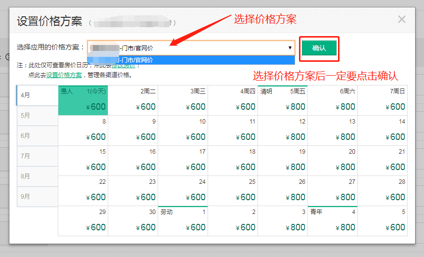 3、直连后,价格只能在云掌柜系统中设置,设置的价格是卖价,套用价格方案,云掌柜只同步价格数字,不同步单位,具体价格单位以Booking后台的单位为准