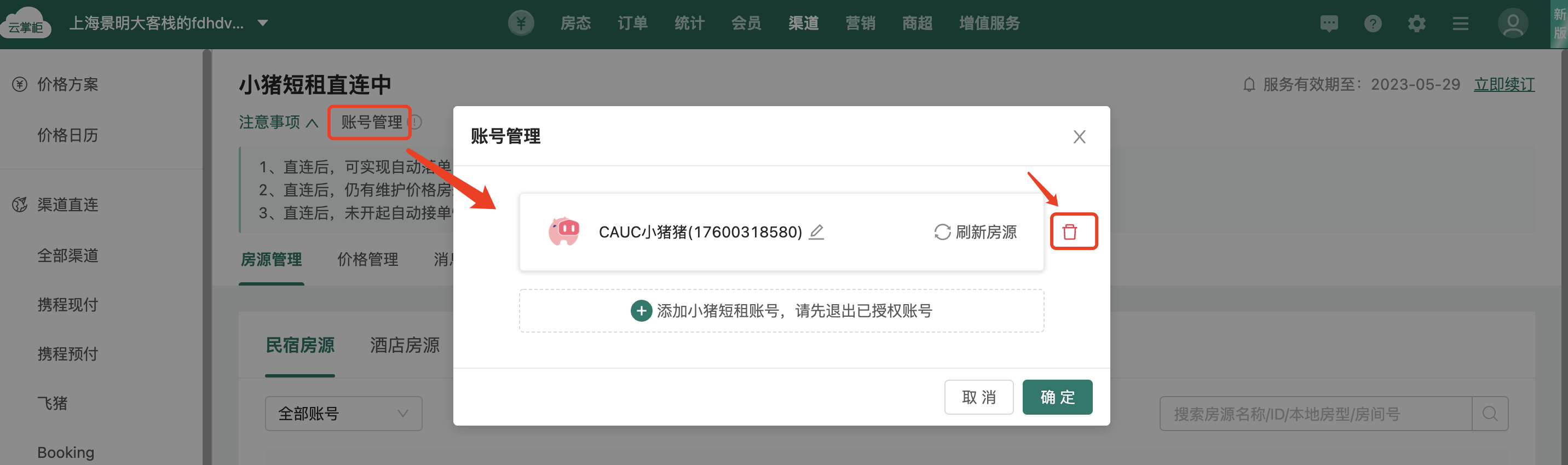 断开直连只能在云掌柜PMS进行操作,小猪后台没有取消授权入口