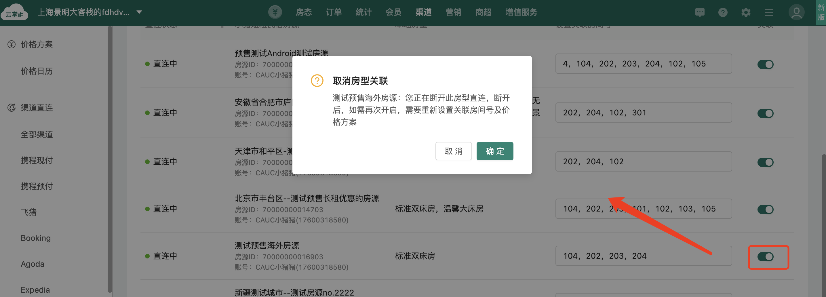 点击房源的关联开关,出现询问弹窗,确认后,此房源断开直连成功