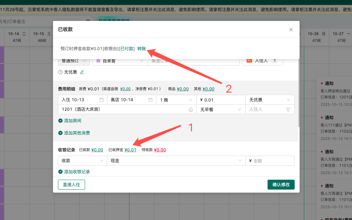 转押金:可编辑收费信息将已收押金转入已预订/已入住的订单中