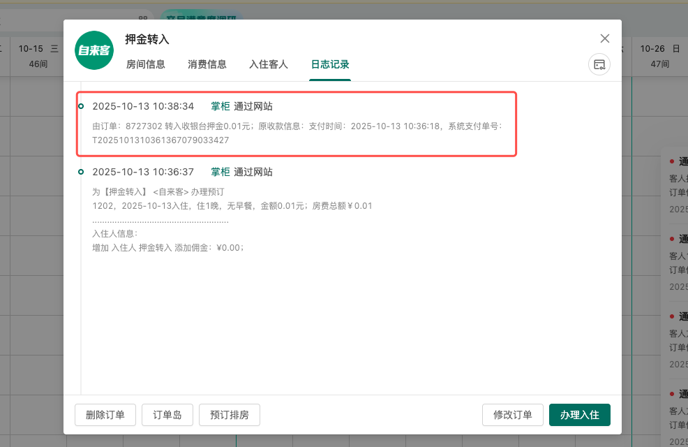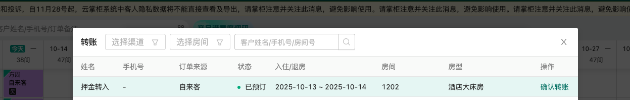 当同一位客人入住后,重新在平台(写成/美团等)预定时,可将收银台收取的押金转到新的订单上