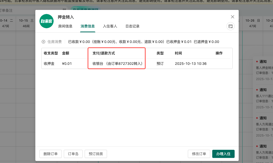 押金转出后,转出的订单不再记录收银信息,转入的订单在订单详情的“消费信息”及“日志”中将做记录