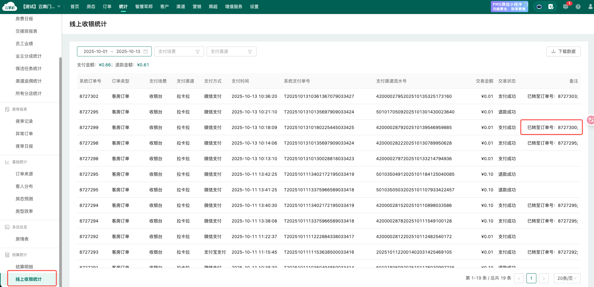 收银信息:可在“线上收银统计”中查看转押金的记录