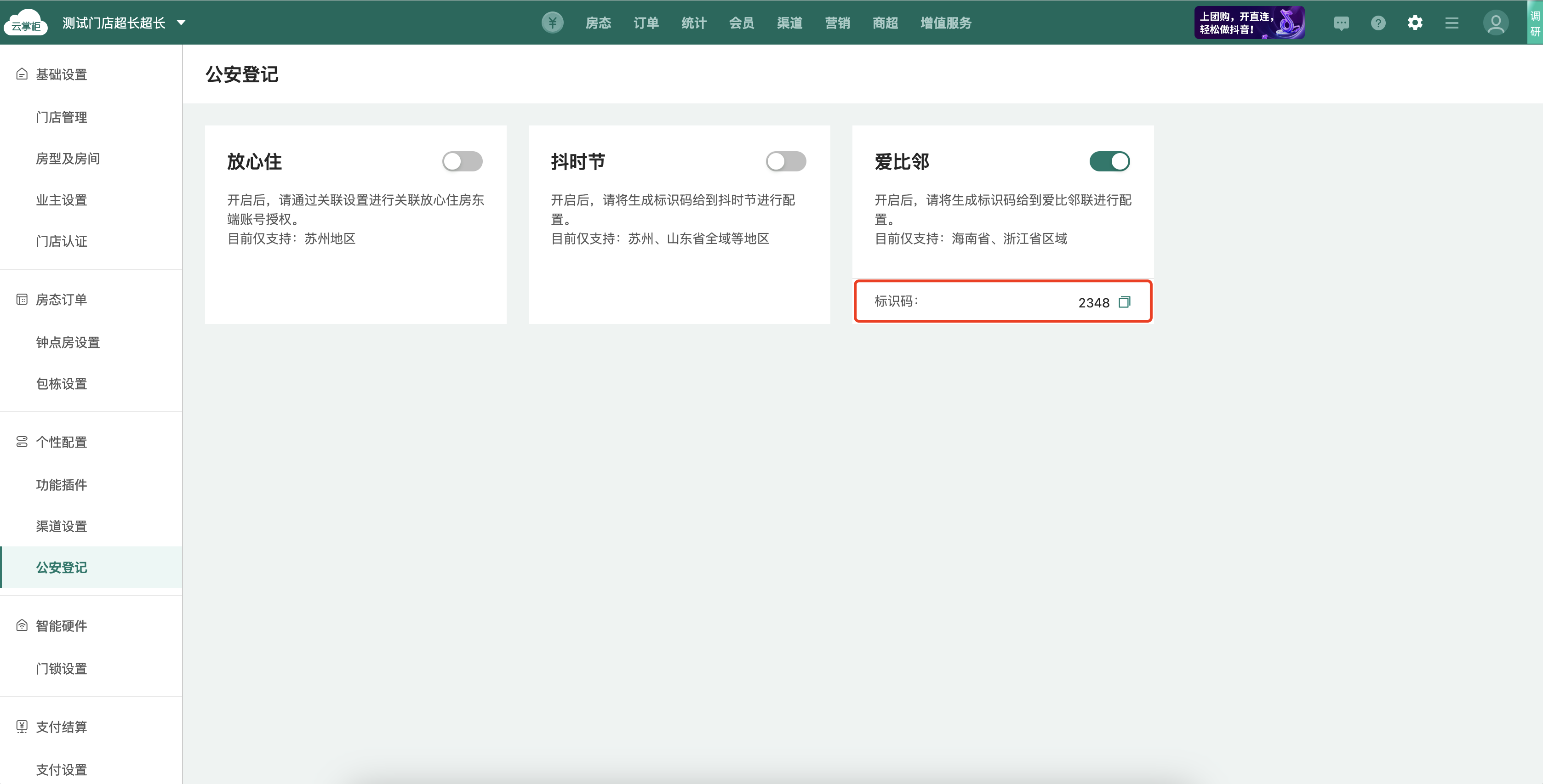 客户确认使用【爱比邻】产品并开通账密后,在云掌柜PMS-公安登记中打开爱比邻开关,将标识码给到爱比邻客服协助配置,配置完成后操作房间关联即可